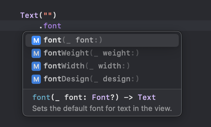 extension Text {} 안에 정의 되어 있고 return 이 다시 Text이다. 이걸 함수형 체이닝이라고 한다.