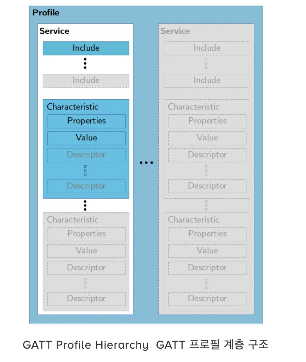 - service 자체에는 데이터가 없음, characteristic을 담는 컨테이너 역할