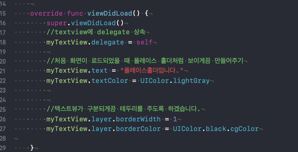 그리고 viewDIdLoad 안에 플레이스 홀더처럼 보이게 끔 만드는 코드를 작성해줍니다.