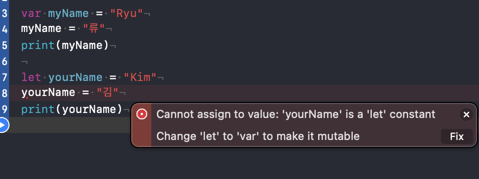 swift는 상수 사용을 권장하고 있습니다. 때문에 다른 사람과 협업을 하고 있을 때, 변수(var)라면 '아 이 값은 어디선가 바뀌겠구나'