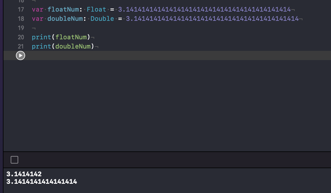 타입추론을 보게 되면 기본값이 Double인 것을 알 수 있었습니다. 이처럼 더 넓은 값을 포함하기 때문에 타입추론에서도 실수는 Double인 셈입니다.