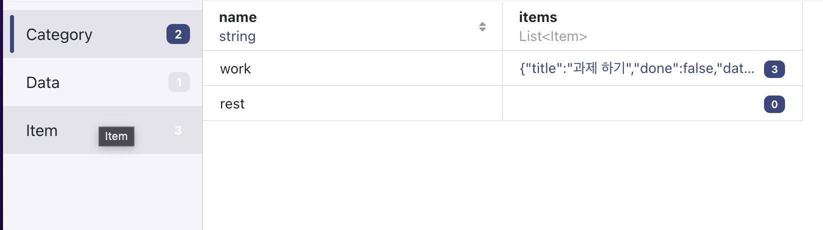 구조를 보면 Category class의 name 그리고 items는 Item이라는 모델과 연결되어 있다.