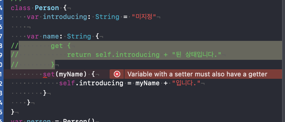 연산 프로퍼티는 get만을 사용할 수는 있지만 set만을 사용할 수는 없다.