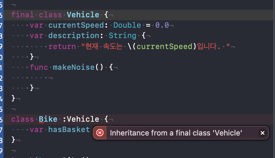 서브클래스에서 특정 메소드, 프로퍼티, 서브스크립트가 오버라이드 되는 것을 방지하려면 final키워드를 사용합니다. 다시말해, final로 선언되면 override되는 것을 막을 수 있습니다. (final func, fin