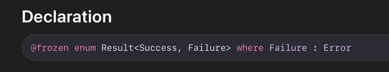 enum 타입이며 Success, Failure라는 두 개의 제네릭한 결과를 리턴한다. 또한 Failure 제네릭은 Error를 상속받은 타입이어야 한다.