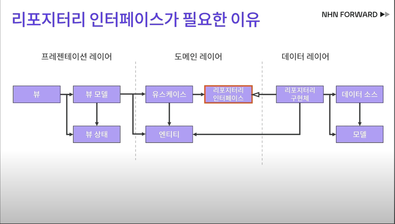 때문에 레포지토리 인터페이스를 도메인 레이어에 두어 유즈케이스는 레포지터리 인터페이스를 의존하고