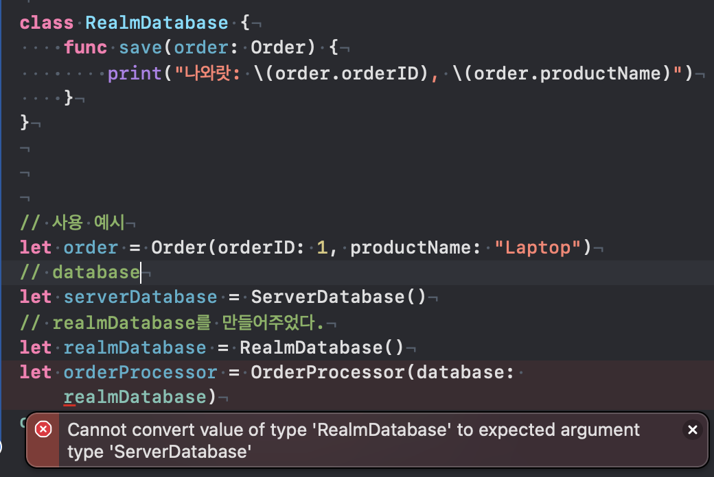 그래서 만약 RealmDatabase로 교체하려면 OrderProcessor 클래스 역시 교체해줘야하는 불편함이 존재한다.