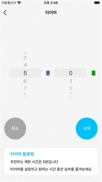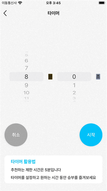 화면을 보면 타이머의 시간을 선택하기 위해서 picker를 조정하고 있는 모습이 보인다.